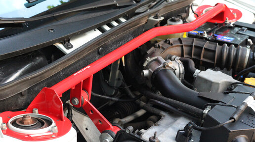 Наиболее доступным вариантом увеличения жесткости кузова и улучшения управляемости является монтаж распорки передних стоек автомобиля. Распорка (растяжка) – это спортивный компонент подвески авто, он связывает верхние опоры стоек, тем самым повышает жесткость кузова. Что дают распорки? Уменьшается крен кузова на 40%