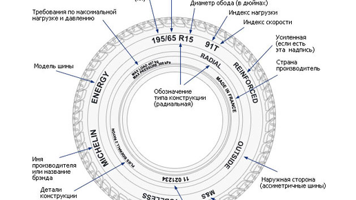 На шине много разных надписей, см. картинку выше. Нас сейчас интересует надпись, обозначающая типоразмер шины...