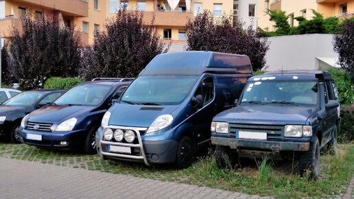 Вот такая компания у меня во дворе. Три машины — три разные концепции автотуризма.
