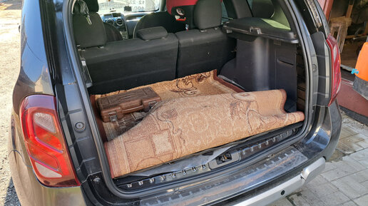Делал ремонт в квартире, возил в багажнике стройматерилы. Думал что кинуть в багажник, чтобы его не испачкать и не ободрать заднюю дверку изнутри. В гараже лежал без надобности домашний коврик размером 99х145 см, положил его в багажник, по ширине подошел идеально...