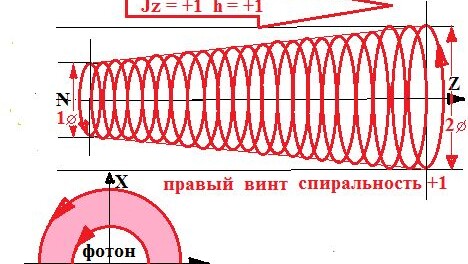 Спиральность фотона может принимать два значения +1 или -1. В чём различия этих фотонов? Фотон с спиральностью +1 имеет правую винтовую закрутку. Если бы была техническая возможность посмотреть на летящий на вас фотон, то вы увидели бы такую круглую картинку, спираль - закрученную против часовой стрелки. С.м. рис. 2. Соответственно фотон с спиральностью -1 имеет левую винтовую закрутку. И летящий на вас фотон, вы увидели бы круглую картинку - спираль, закрученную по часовой стрелке. С.м. рис. 3. Рассмотрим подробнее как образуются такие картинки с спиральностью +1 и спиральностью -1...