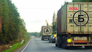 Варианты ответов: а) разрешено б) запрещено в) разрешено, если грузовик A едет со скорость менее 30 км/ч. Правильный ответ указан в конце статьи. Подумайте, прежде чем его смотреть. ПДД: 11.1. Прежде чем начать обгон, водитель обязан убедиться в том, что:
