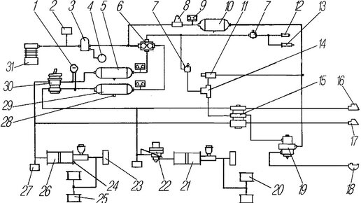 Перед прокачкой тормозной системы автомобилей Урал 4320, 43206, 5557, нужно убедиться в ее работоспобности. Проверка тормозной системы В первую очередь, измерьте на выходе из обоих отделов тормозного крана давление и протестируйте действие тройного защитного клапана (5, см. схему). Чтобы сделать это, контрольные манометры подключите к линии "тормозной кран-пневмоусилитель" и, когда давление будет 650-800 кПа (6...
