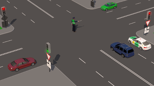 Кому из водителей разрешено движение в этой ситуации? Пиши свою версию в комментариях. А наш ответ читай ниже. Сигналы регулировщика Как проезжать перекрестки, регулируемые сигналами светофора, мы уже узнали. Оказалось, ничего сложного. Однако иногда устройство выходит из строя и на помощь присылают регулировщика. И тогда он определяет очередность проезда. Поэтому автомобилисты, завидев человека с полосатым жезлом, порой теряются в догадках, что же означают его сигналы. Исправляем ситуацию. Жестов регулировщика, мягко сказать, немного, поэтому разобраться не составит особого труда...
