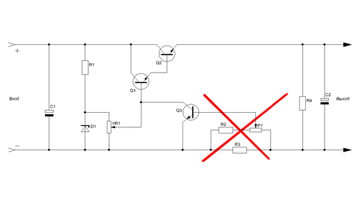 Когда вижу подобную схему стабилизатора напряжения, возникает желание переставить датчик тока в другое место. Здесь датчик тока подключен к выходу стабилизатора вместе с нагрузкой. В итоге напряжение стабилизируется на сумме сопротивлений, которая состоит из сопротивления нагрузки и сопротивления датчика тока. При увеличении тока через нагрузку увеличивается напряжение на датчике тока, следовательно, напряжение на нагрузке уменьшается. Чтобы уменьшить уменьшение напряжения в нагрузке при росте тока нагрузки, необходимо датчик тока установить до стабилитрона...