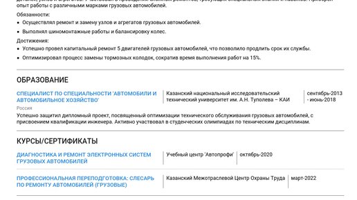 Пример резюме автослесаря по ремонту грузовых автомобилей 2025