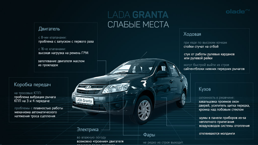 Гранта начинает «радовать» проблемами, едва выехав из салона. Таксопарк отметил, что многие неисправности связаны с качеством сборки — будто завод спешил и забыл закрутить половину болтов. Криво стоящий руль и отсутствие сход-развала. Сразу после покупки руль тянет в сторону, а колеса не отрегулированы. Дилеры заявляют, что сход-развал не входит в предпродажную подготовку. Стоимость исправления — 2–3 тысячи рублей. Дворники и рулевая колонка. Болты на дворниках и рулевой колонке откручиваются сами по себе — их просто недокрутили на заводе...