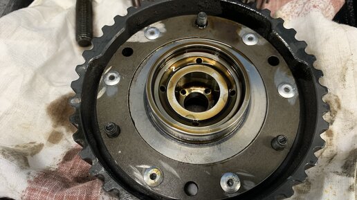 #VolvoXC90 2006 года с мотором 2,5т. Пробег по одометру 253 000 км.⠀ ⠀ Со слов владельца, #Вольво приобретён недавно и предыдущая история эксплуатации покрыта мраком. В частности, неизвестно сколько времени и километров прошло с замены ремня #ГРМ. ⠀ #Автомобиль уже где-то диагностировали, и неизвестные мастера приговорили к замене обе муфты #VVT. Кроме этого на двигателе имеется запотевание сальников рапредвалов и коленвала.⠀ ⠀ При демонтаже муфты впускного вала выяснилось, что узел некорректно восстановлен и собран на алюминиевых заклёпках...