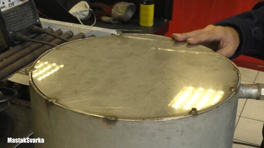 Привет. Принесли недавно в ремонт бак из нержавеющей стали. Задача была поставлена следующая. Срезать старое, кривое днище из миллиметровки и на его место установить новое толщиной 3 мм. Сам бак сделан из стали толщиной 3 мм. Старое днище срезал и установил новое на прихватки. Рекомендую устанавливать прихватки как можно чаще, чтобы избежать лишних деформаций при сварке. В бытовых условиях не возможно определить марку нержавеющей стали, поэтому выбор сварочных материалов затруднён. В этом случае, когда марка стали не известна, я использую электроды марки ЭА-395/9...