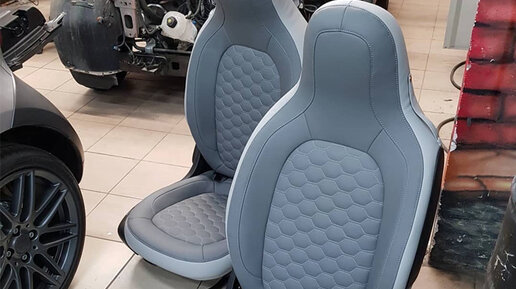 Очень мне нравятся эти "пузыри" Смарты (#Smart ) #Fortwo , они компактны и чтоб преобразить его #салон нужно не так много - #перетянуть два сидения, #руль , #торпедо и при необходимости маленький потолок. В этом #Смарте #Форту сидения были не просто перетянуты, но с дизайном - в центре сидений и спинок стилизованная прострочка под пчелиные соты. Рабочая плоскость (там, где кожа соприкасается с водителем и пассажиром) выполнена в более темном сером цвете, а боковинки - в светло-серой коже...