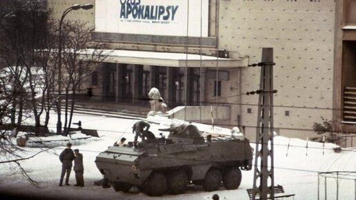 1981 год, декабрь. Военное положение в Польше. Бронетехника на фоне кинотеатра с афишей американского фильма Фрэнсиса Копполы «Апокалипсис сегодня».