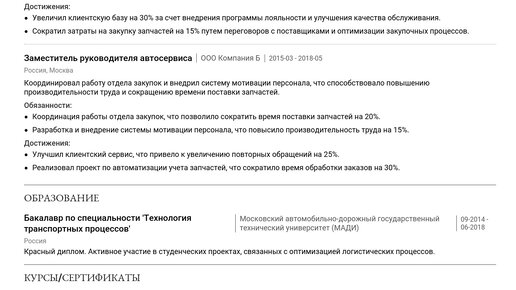 Пример резюме руководителя автосервиса поможет вам понять, как составить документ, который приведет к желаемой работе. Изучение готовых примеров — самый быстрый путь к созданию эффективного резюме. 🚀 В нашей статье мы собрали все для создания сильного резюме руководителя автосервиса, которое точно заметят рекрутеры: . Вы узнаете, как правильно описать опыт работы и ключевые достижения, какие навыки сейчас ценятся работодателями, и как адаптировать ваше резюме под конкретные вакансии, повышая шансы на успех...