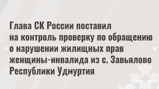 Глава СК России поставил на контроль проверку по обращению о нарушении жилищных прав женщины-инвалида из с. Завьялово Республики Удмуртия