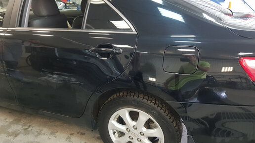 К нам на кузовной ремонт привезли авто Тойота Камри черного цвета с повреждениями левого переднего и заднего крыльев (вмятина и царапина), левой передней и задней дверей (глубокие царапины). Кроме того, треснул и был поцарапан задний бампер (тоже пострадала левая сторона). Вся левая стороны выглядела не лучшим образом, и нуждалась в восстановительных работах. Благо, на станции работают исключительно профессионалы и мастера своего дела, которые знают, как вернуть детищу японского автопрома первозданный вид...