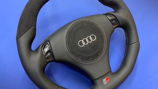 🚘✨ Тюнинг руля Audi в пакете S-line — анатомический руль из премиум-материалов идеально сидит в руках и радует глаз. ✅ - анатомия мягким полиуретаном; ✅ - сверху ALCANTARA, снизу NAPPA; ✅ - бока NAPPA с псевдоперфорацией; ✅ - подушка в комбо NAPPA и ALCANTARA; ✅ - прострочка серыми нитками...
