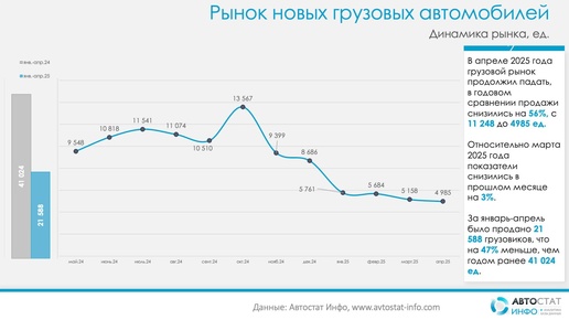 Рынок новых грузовых автомобилей в России в апреле 2025 года Рынок новых грузовых автомобилей в России в апреле 2025 года продолжил развиваться в понижающем тренде. По данным «Автостат Инфо», продажи снизились на 56% по сравнению с апрелем 2024 года и составили 4985 единиц, в то время как в прошлом году было реализовано 11 248 автомобилей. Этот спад сохраняется и в помесячном срезе: продажи в апреле упали на 3% по сравнению с мартом 2025 года. Напоминаем, что снижение рынка в марте относительно февраля было еще более значительным — минус 9%...