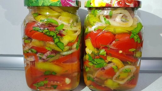Салат готовится просто, а получается очень вкусно. Ингредиенты: 1. Помидоры - 1 кг. 2. Сладкий болгарский перец - 250 гр. 3. Репчатый лук - 250 гр. 4. Свежая зелень. 5. Чеснок - 5 зубчиков. 6. Лавровый лист - по 1 шт. в каждую банку. 7. Черный молотый перец - по 5 шт. в каждую банку. 8. Растительное масло - 50 мл. 9. Сахар - 1/2 ч. ложки в каждую банку объемом 700 мл.. 10. Соль - 1 ч. ложка в овощи. 11. Уксус 9% - 1 ч. ложка в каждую банку объемом 700 мл. Способ приготовления: 1. Помидоры разрезать на 4 части...