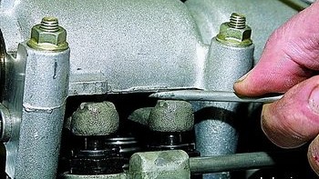 Работу проводим в случае выхода из строя одной или нескольких гидроопор рычагов привода клапанов. Снимаем крышку головки блока цилиндров (см. тут). Для оценки состояния гидроопоры вставляем отвертку между кромкой корпуса подшипников распределительного вала и рычагом привода клапана. При этом кулачок распределительного вала должен быть обращен к рычагу привода клапана «затылком» (клапан закрыт). Опираясь отверткой о корпус подшипников, давим через рычаг на гидроопору. В нормальном состоянии гидроопора должна прожиматься со значительным усилием...