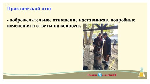 В октябре 2023 г с одним из классов Школы экономики и права был проведён профориентационный урок по химии на тему "Металлы". Важное место занимает выездной мастер-класс в кузницу. Самоанализ мероприятия приведён на слайдах...