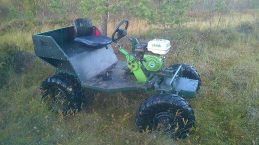 Мини-вездеход из мотоблока для поездок на охоту и рыбалку собрал народный умелец из сельской глубинки. Причем машина получилась полноприводной с колесной формулой 4х4, задний мост приводится в действие за счет цепной передачи, что в разы повышает проходимость по бездорожью Рама сварена из профиля 40 х 40 х 2 мм, колеса низкого давления от импортной модели квадроцикла, рама отделана пластиком для защиты от попадания влаги на металл. Двигатель 7 лошадиных сил от мотоблока, Рулевое управление от Отечественного автомобиля ВАЗ 2108...