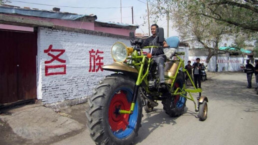 Будучи этничным уйгуром, Абдулладжан построил самый большой китайский мотоцикл. Этот 30-летний гений живет в автономном округе Чанцзи-Хуэйский, в Китае. Для того чтобы создать такого гиганта, он использовал различные детали...угадайте откуда?... со свалки конечно же, это же Китай! Зачем он это сделал? Наверное, Абдулладжану не нравится, что в Китае не уважают водителей на скутерах и мотоциклах. Пусть теперь кто-то попробует подрезать этот "мопедик". Постройка 300-килограммового мототрактора заняла около года...