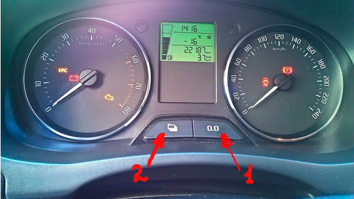 Интервал напоминаний настроен на отсчет 372 дней, либо 15 000 км пробега в зависимости от того, что наступит первым. Как убрать напоминание о ТО для Шкоды Фабия 1. Зажигание должно быть выключено. Зажимаем кнопку сброса суточного пробега №1 (фото №1) 2. Далее, держа эту кнопку, вставляем ключ в зажигание. 3. После чего отпускаем ее и зажимаем кнопку папки №2 (фото №1) 4. После того, как пропадет изображение сервисного ключа — выключаем зажигание. 5. Дожидаемся пока погаснет экран бортового компьютера...