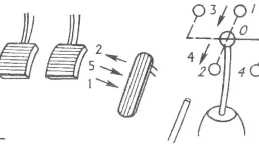 Синхронизаторы на всех передачах сделали свое дело: переключение передач стало бесшумное, а обучение вождению значительно упростилось. Сначала рассмотрим метод, по которому обучают в автошколах, а затем поговорим о его преимуществах и некоторых недостатках. Трогание с места точно такое же, как мы рассмотрели (см. рис. 5). Далее (Рис. 9) идет разгон на 1 передаче (нажатие 1 на педаль управления дроссельной заслонкой), нажатие 2 на педаль сцепления и отпускание 2 педали "газа", выключение 3 первой...