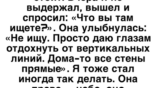 Соседка сверху часто выходит на балкон и просто смотрит в небо. Ни телефона, ни книги. Просто стоит. Вчера я не выдержал, вышел и спросил: «Что вы там ищете?». Она улыбнулась: «Не ищу...