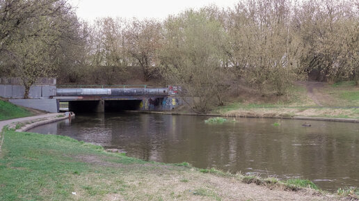 Не зная заранее, никогда не скажешь, что это метромост. Ежедневно много людей проходят по нему, гуляя с колясками, собачками или просто по делам. Если спуститься вниз, и пройти под мостом вдоль речки, можно услышать знакомый гул метро, и тогда догадаться, что здесь идут поезда. Это самый настоящий метромост. На мосту расположены крытые пути, помещенные в бетонные тюбинги. Сверху тюбинги засыпаны землей. Под мостом, действительно, находятся просветы и вдоль реки может пройти человек. Мой рост 1.78, и приходится чуть пригибаться, то есть высота просветов немного ниже...