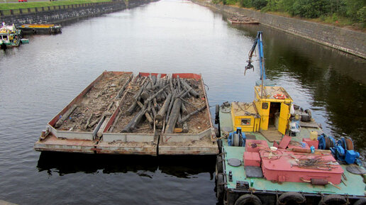 Тихий Петербург. Чистка дна Обводного канала в Питере. Очень медленная! Лет пятьдесят назад у нас ещё практиковался сплав леса плотами по Неве. На отстой плоты ставили в Обводный канал. В пятидесятые годы прошлого столетия мы мальчишки бегали ловить с плотов мелкую рыбёшку. Мама меня за такие развлечения порола: "Утонешь лучше домой не приходи!" Но я не прекращал - бегал рыбачить, и по сей день рыбачу! Много брёвен из плотов терялось. Они впитывали воду, набухали и тонули. Под водой брёвна загнивали и продуктами распада отравляли воду...