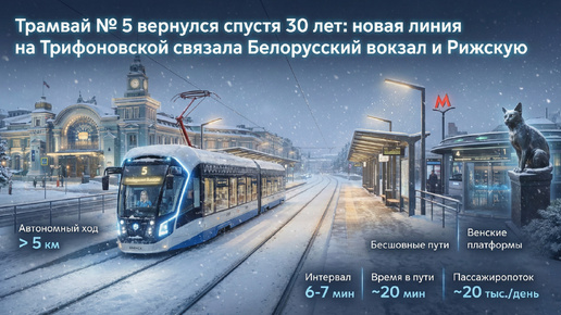 Есть новости, которые звучат “ну ок, транспорт”. А есть такие, от которых город становится удобнее — каждый день, без пафоса. В Москве снова ходит исторический трамвай № 5: он связал Белорусский вокзал и метро “Рижская”кратчайшим путём — по Трифоновской улице, где трамвая не было почти три десятилетия. Сергей Собянин открыл новую трамвайную линию на Трифоновской улице и подчеркнул ключевое: восстановили связь между двумя крупными транспортными узлами, Белорусским и Рижским, и сделали это на современных “малошумных” путях...