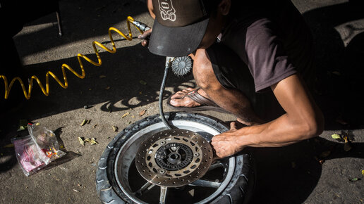 Практически каждый из нас, автомобилистов, сталкивался с пробитым колесом. Со мной эта мелкая неприятность случилась спустя год жизни на райском острове. О том, как происходит шиномонтаж в Индонезии, в частности на Бали, я и хочу вам рассказать. Уторм было замечено, что переднее колесо спускает. Подкачали, поехали дальше. Но колесо продолжало пропускать. Заметили, что попал кусок металла. Такие вопросы на арендных байках решаются просто. В большинстве случаев турист сам должен позаботиться о замене резины, разумеется за свой счет...