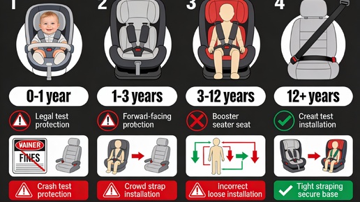 Одна из самых частых ошибок водителей — неправильное крепление ребёнка в машине. Люди ездят с ребёнком на коленях, с ремнём безопасности, без специального кресла. Штраф за это — от 3 000 до 30 000 ₽. Плюс, при ДТП ребёнок может не пережить аварию. Почему детское кресло спасает жизни При ДТП с силой G машина немедленно замедляется. Ребёнок продолжает двигаться вперёд со скоростью 50-100 км/ч. Без кресла ребёнок ударяется о приборную панель, крышу или переднее сиденье. При скорости 50 км/ч удар эквивалентен падению с 4-го этажа...