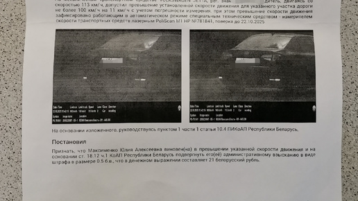 Я не любитель нарушать правила, езжу по-пенсионерски. Но по пути из Карелии в Минск в мае мы всё-таки хватанули штраф. О чем я узнала только в июне. Расскажу как можно проверить себя 👌 В Беларуси, в отличии от России, нештрафуемый порог превышения скорости составляет 10 км/ч. Это касается и работы фотофиксации и работы сотрудника ГАИ с "Визиром". Погрешность камеры фотофиксации составляет +- 1 км/ч. 1 базовая величина на сегодняшний день составляет 42 беларуских рубля (почти 1170 российских). ...