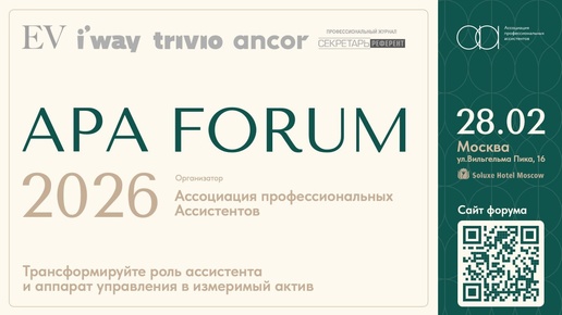 📍 28 февраля 2026 | Москва APA FORUM 2026 — федеральный форум операционной эффективности аппаратов управления и трансформации роли ассистентов. Организатор — Ассоциация профессиональных ассистентов (cайт: https://apa-assistants.com) Форум объединит ассистентов первых лиц, руководителей аппаратов, HR и представителей бизнеса для обсуждения ключевого вопроса: как организовать работу административной поддержки руководителей из сервисной поддержки в управляемый актив, влияющий на скорость решений, качество и устойчивость компании...