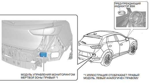 Модуль контроля слепых зон (BSM) обнаруживает объекты в задней части автомобиля с помощью излучения электромагнитных волн, эмитируемых радаром, и управляет системой мониторинга слепых зон (BSM). Каждый из модулей, расположенных по одному слева и справа на торцевой панели в задней части кузова имеет небольшой вес, что было достигнуто за счет использования твердого пластика для корпуса модуля. Модуль контроля слепых зон (BSM) имеет один встроенный передатчик, который излучает электромагнитные волны с частотой 24 ГГц, и два приемника, которые принимают их отражение от объекта...