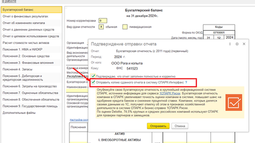 СПАРК-Интерфакс – это система проверки контрагентов и сбора информации об организациях. Отправка отчетности в СПАРК может оказаться решающим фактором при оценке вашей компании другими участниками рынка как клиента. Также публикация отчетности повышает шансы на одобрение кредита и возможное снижение ставки. Пользователям сервиса 1С-Отчетность доступна отправка бухгалтерской отчетности в информационную систему СПАРК-Интерфакс. Для того чтобы отправить отчетность в СПАРК-Интерфакс в окне подтверждения...