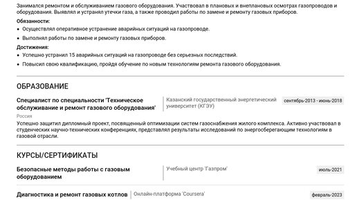 Пример резюме слесаря по ремонту и обслуживанию газового оборудования 2025