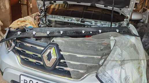Вздутие жабо на Renault Duster, устранение деформации пластика. Дребезг бачка стеклоомывателя, сетка на воздуховод.