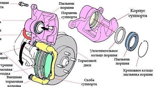 Схема суппорта не является сложной и одинакова в большинстве моделей автомобилей. Нажатие на педаль тормоза приводит к появлению давления в тормозной магистрали, воздействующего на поршни суппортов...