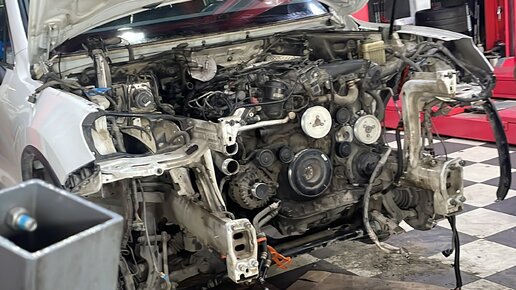 Доброго времени суток, сегодня у нас в ремонте Touareg с 3х литровым турбодизелем на замене цепей и устранении течей коих в этом двигателе огромное количество) Начинаем с разборки. Я выбрал способ извлечения двигателя через перед автомобиля (да знаю что можно опускать вниз вместе с коробкой и это быстрее, но по ряду причин пришлось выбрать этот способ) И так разбираем морду и снимаем переднюю панель вместе с радиаторами Далее снимаем все навесное(компрессор кондиционера, насос Гур, генератор а так...