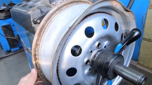 Решил использовать недавно услышанный способ от моего знакомого для правки штампованных дисков. Подвернулся случай ко мне на ремонт принесли диск помятый в четырех местах. Это только с одной стороны, ну на фото я думаю все хорошо видно. Сейчас мы будем делать. Эта информация будет полезна не только работникам шиномонтажа, но и обычным автолюбителям. Поле прочтения этого текста и просмотра фото, вы поймете что даже из такого почти металлолома можно сделать рабочую деталь. ➡️Сперва устанавливаем на стенд для правки литых дисков, для выдавливания вмятин...
