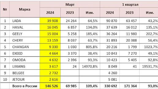 Статистика продаж новых автомобилей в России за март 2024 (+ первый квартал): выход на докризисный уровень