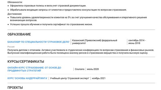 Нужен эффективный пример резюме специалиста по страхованию? Изучение готовых, правильно составленных резюме — лучший способ быстро создать свое, чтобы получить работу. Здесь вы найдете с учетом актуальных требований работодателей к навыкам. Мы покажем, как составить резюме, которое выделит вас среди кандидатов. Узнаете, как его адаптировать под конкретную вакансию. Изучив пример, вы сможете создать резюме с помощью нашего конструктора резюме. Заголовок резюме – первое, что видит рекрутер. Он должен быть чётким, информативным и соответствовать вашему опыту и карьерным целям...