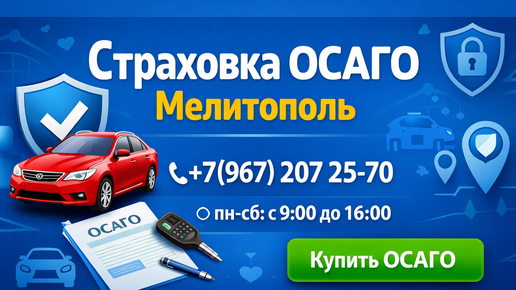 Страховка ОСАГО в Запорожской области с 1 января 2025 года. Гражданам, новых территорий России, следует знать, что управлять транспортным средством без полиса обязательного страхования гражданской ответственности (ОСАГО) запрещено. ✅Оформить страховку ОСАГО в Мелитополе ✅ Скидка до 30% для пенсионеров и инвалидов ✅Защита от дронов ✅Действие полиса по всей России 🔹г. Мелитополь, ул. Ломоносова 132 🔹График работы: пн-вс с 8:00 до 16:00 🔹Тел: +7 (967) 207 25 70 (Ватсап, Телеграмм) ❗Возможна доставка полиса ОСАГО по Запорожской обл...