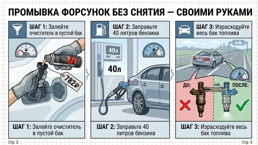 Промывка форсунок на сервисе — удовольствие не из дешёвых: 3 000–8 000 рублей плюс полдня времени. Но есть способ сделать это самому, без снятия форсунок, без инструментов и без поездки на СТО. Вся процедура укладывается в три действия и один бак бензина. Рассказываем, как работает промывка топливной системы через бак, когда её стоит делать и какие нюансы важно учесть. Загрязнения в топливной системе появляются у всех — даже если вы заправляетесь только на проверенных станциях и льёте 95-й или 98-й...