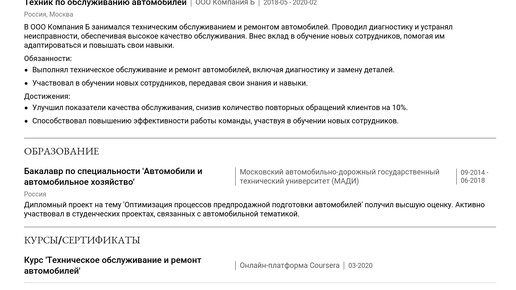 Пример резюме техника по подготовке новых автомобилей 2025 - Советы