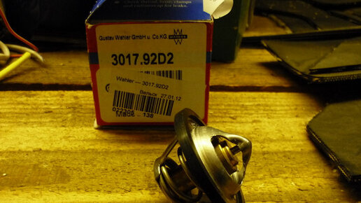 Для начала приобретаем сам термостат, который нам нужно заменить. Каталожные номер 317.92D2, который вы сможете увидеть на фото. Теперь первым делом нужно слить антифриз. Снимаем трубку с расширительного бачка и опускаем как можно ниже, не забыв при этом подставить пустую тару...