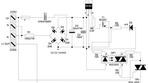 Этот простой модуль работает как термостат благодаря использованию Dallas - DS1821 в качестве датчика температуры и контроллера. Представленная в статье схема может быть использована в качестве терморегулятора в отопительных котлах (защита) или в бытовых водогрейных котлах. Принципиальная схема представлена на рисунке. Он также может довольно эффективно защищать электронные устройства от перегрева, отключая их от источника питания, когда температура поднимается выше запрограммированного верхнего порога, и снова включая их после того, как она упадет до требуемого уровня...