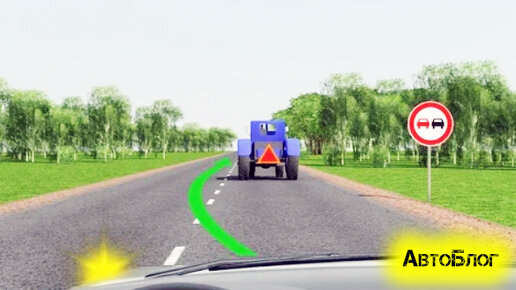 Это достаточно распространенная ситуация, с которой легко можно столкнуться на дороге. Так, перед нами изображен красный легковой автомобиль, перёд которым движется тихоход в виде трактора. Справа на дороге находится знак, запрещающий обгон на данном участке, а слева ещё проходит сплошная полоса. Возникает вопрос: можно ли активировать левый поворотник, и начать маневр по обгону впереди идущего тихохода? Давайте рассмотрим, как следует поступить в данной ситуации, согласно правилам дорожного движения...